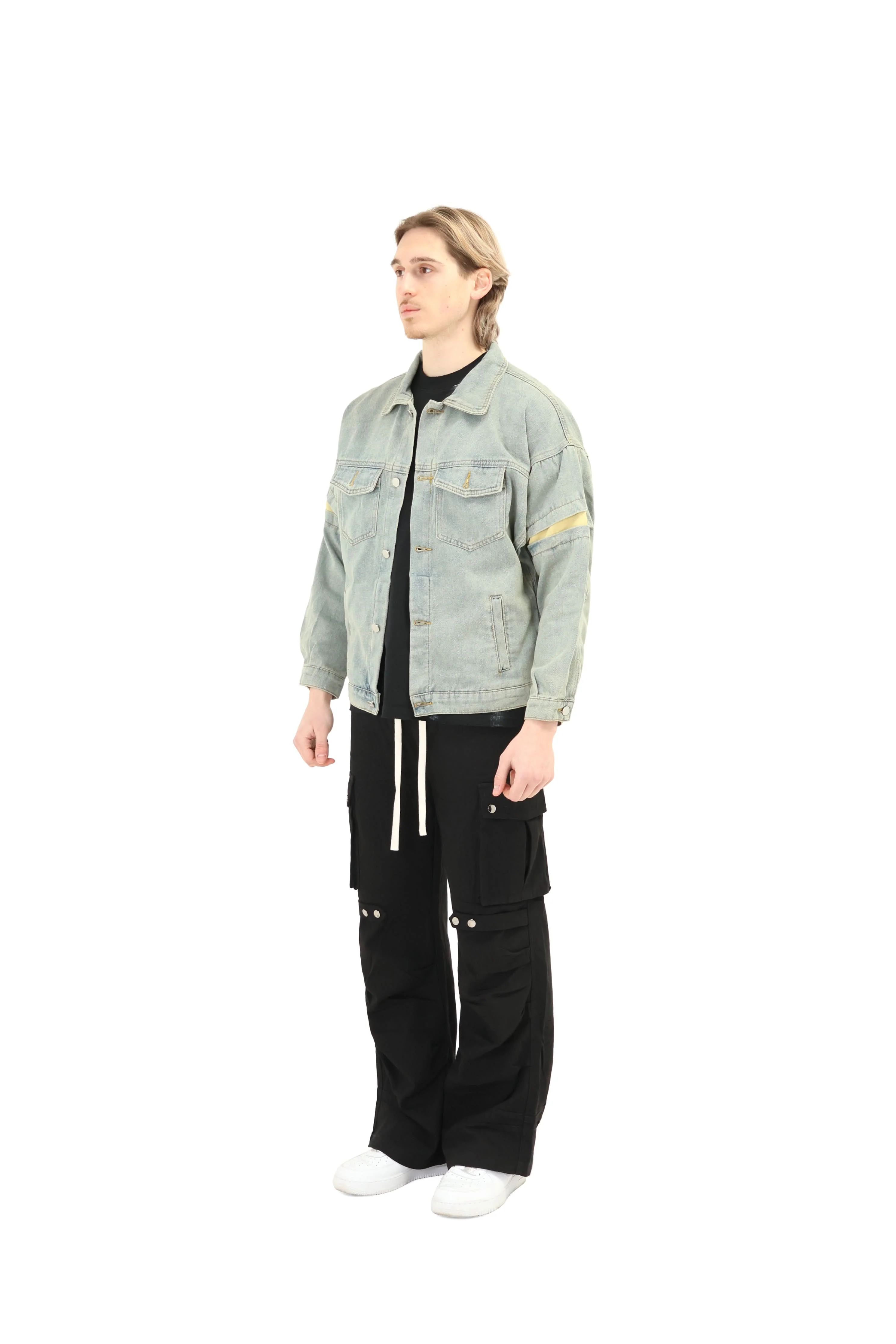 Our Detailed Denim with a slightly cropped fit. With a silver press buttons and 2 pockets on the chest. This jacket is complimented with its unique design on its sleeves and can be worn both casually or as a staple piece.Ā